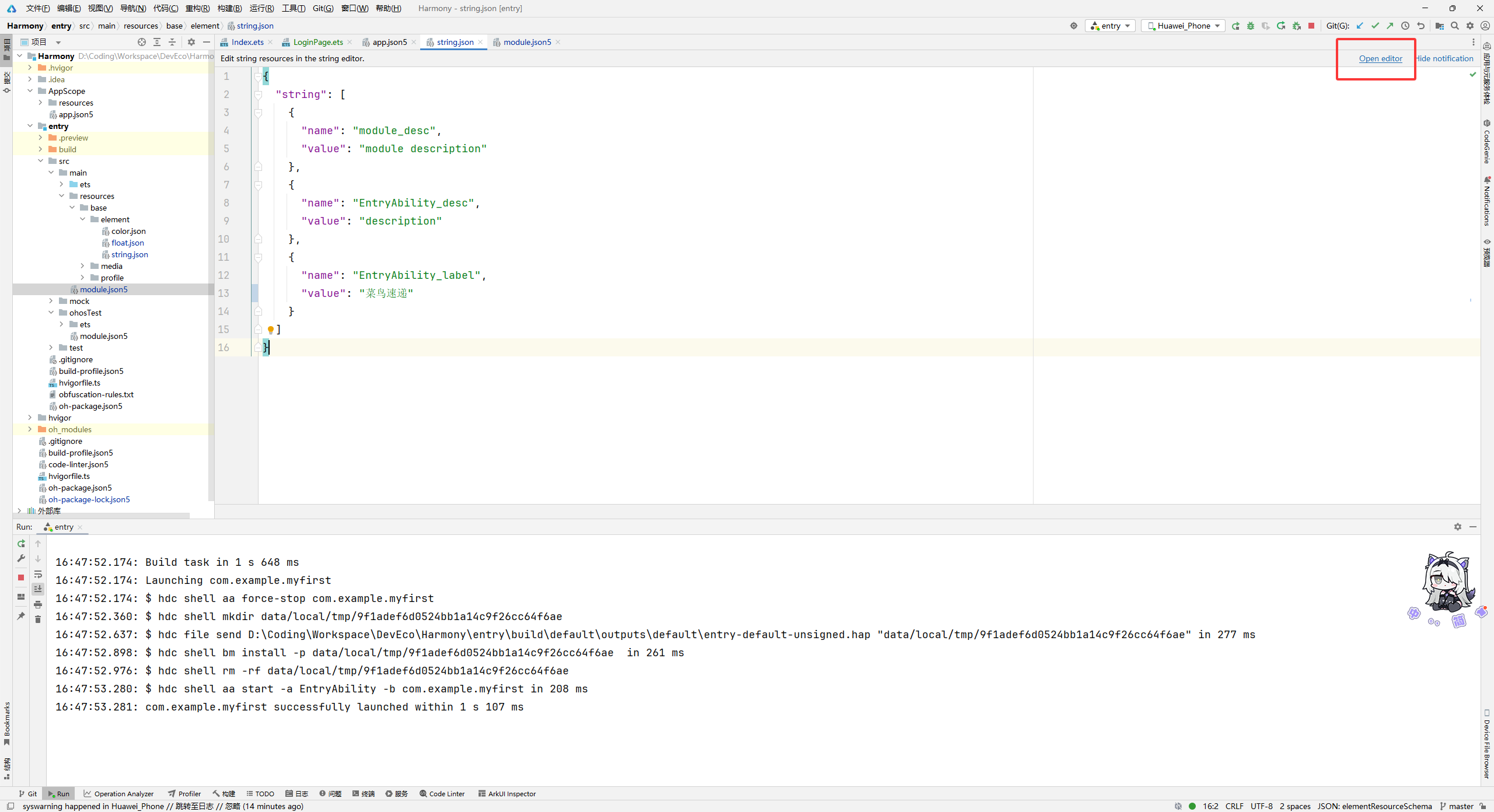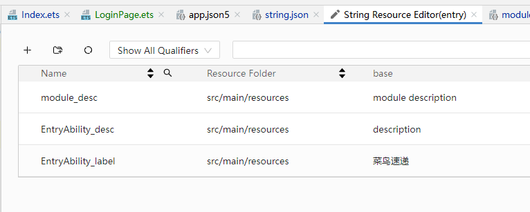 1 2 3 4 5 6 7 8 9 10 11 12 13 14 15 16 { "string": [ { "name": "module_desc", "value": "module description" }, { "name": "EntryAbility_desc", "value": "description" }, { "name": "EntryAbility_label", "value": "菜鸟速递" // 配置应用名称 } ] }
