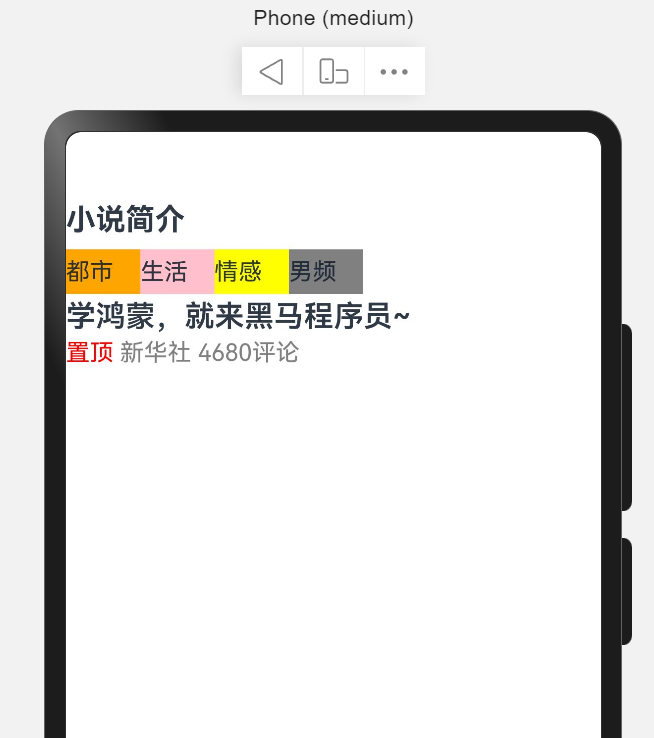 build() { RelativeContainer() { Column() { // 如果不设宽度的话就会默认居中显示 Text("小说简介") .width("100%") .height(40) .fontSize(20) .fontWeight(FontWeight.Bold) Row() { Text("都市") .backgroundColor(Color.Orange) .height(30) .width(50) Text("生活") .backgroundColor(Color.Pink) .height(30) .width(50) Text("情感") .backgroundColor(Color.Yellow) .height(30) .width(50) Text("男频") .backgroundColor(Color.Gray) .height(30) .width(50) } .width("100%")