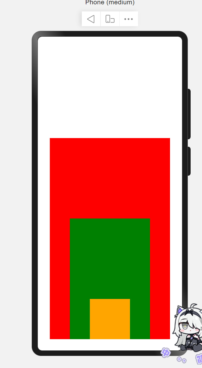 | build() { RelativeContainer() { Stack({ alignContent: Alignment.Bottom }) { Text() .width(300) .height(500) .backgroundColor(Color.Red) Text() .width(200) .height(300) .backgroundColor(Color.Green) Text() .width(100) .height(100) .backgroundColor(Color.Orange) } .width("100%") .height("100%") } }
